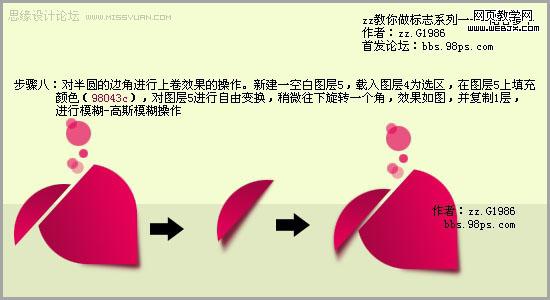 8、對半圓的邊角進行上卷效果的制作。新建一個空白圖層5,載入圖層4為選區,在圖層5上填充顏色:98043c,對圖層5進行自由變換,稍微往下旋轉一個角度,效果如下圖,并復制1層,執行:濾鏡 > 模糊 > 高斯模糊,數值自定。