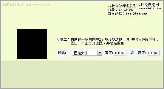 2、再新建一個空白圖層2,選擇矩形選框工具,并固定大小,畫出一個正方形選區,并填充黑色。