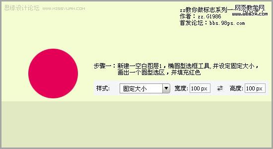 1、新建一個大小適當的文檔,背景填充淡黃色。新建一個空白圖層1,選擇橢圓選框工具,并設定好固定大小,畫出一個圓形選區,并填充紅色。
