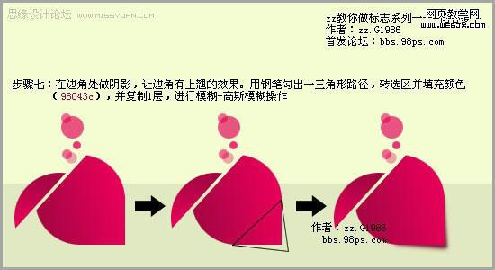 7、在邊角處做陰影,讓邊角有上翹的效果。用鋼筆勾出一個三角形路徑,轉為選區后填充顏色:#98043c,并復制1層,執行:濾鏡 > 模糊 > 高斯模糊,數值自定。