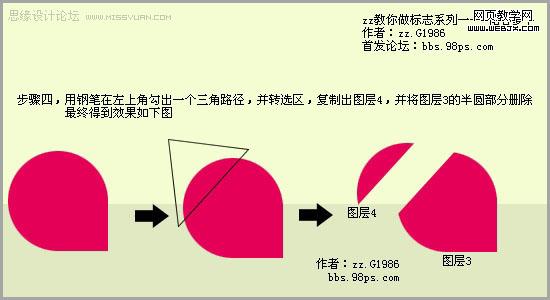 4、用鋼筆在左上角勾出一個三角路徑,并轉為選區,復制出圖層4,將圖層3的半圓部分刪除,效果如下圖。