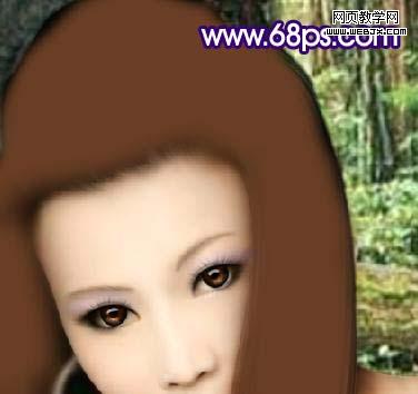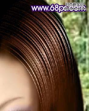 6、頭發(fā)部分的處理,先用涂抹工具將頭發(fā)涂順,再新建一個圖層選擇棕色涂抹在頭發(fā)上,圖層混合模式改為“顏色”,接著用鋼筆工具描出如下圖所示的路徑,然后描邊路徑,降低下不透明度。最后給頭發(fā)加點高光。