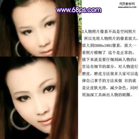 2、人物照片像素不高,所以想將人物照片的像素放大,放大到2000 * 1981 像素,放大后照片會變模糊,這個事正常的,接下來就是仔細(xì)刻畫人物的五官,還有細(xì)節(jié)的部分。對人物進(jìn)行磨皮,磨皮的方法很多,大家可以選擇自己拿手的方法來做,目的就是讓皮膚光滑,減少雜色,同時用加深工具畫出人物的眼影。