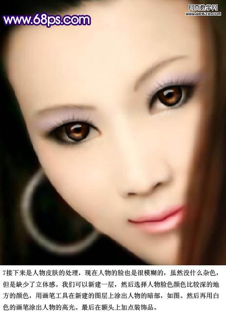 7、接下來是人物皮膚的處理,現(xiàn)在人物的臉也是很模糊的,雖然沒什么雜色,但是缺少了立體感,我們可以新建一層,然后選擇人物臉色顏色比較深的地方的顏色,用畫筆工具在新建的圖層上涂出人物的暗部,如下圖。然后再用白色的畫筆突出人物的高光,最后在額頭上加點裝飾品。