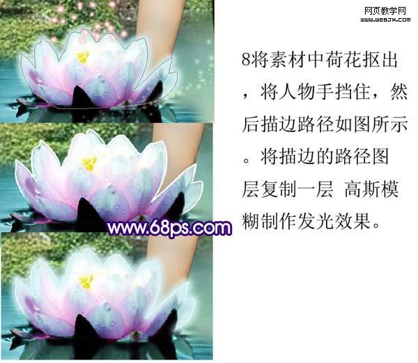 9、將素材中荷花摳出,將人物手擋住,然后描邊路徑如下圖所示。將描邊的路徑圖復(fù)制一層,高斯模糊,制作出發(fā)光效果。