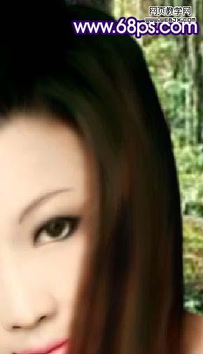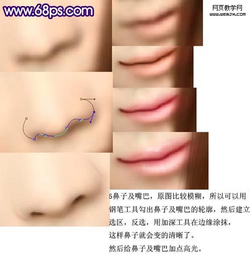 5、鼻子及嘴巴,原圖比較模糊,所以可以用鋼筆工具勾出鼻子及嘴巴的輪廓,然后建立選區(qū),反選,用加深工具在邊緣涂抹,這樣鼻子就會變得清晰了。然后給鼻子及嘴巴加點高光。