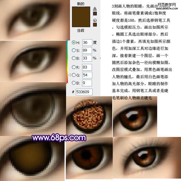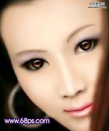 用橢圓選框工具選出眼球部分,然后描邊1個像素,再填充如圖所示的顏色,并用加深工具對邊緣進(jìn)行加深。接著新建一個圖層,畫一個圓,填充深褐色,然后添加雜色,再執(zhí)行徑向模糊,確定后把圖層混合模式改為“疊加”。用黑色畫筆畫出人物的瞳孔,最后用白色畫筆添加人物的高光部分。眼睛的制作基本完成。可以適當(dāng)?shù)挠娩摴P或睫毛筆刷給人物加上睫毛。