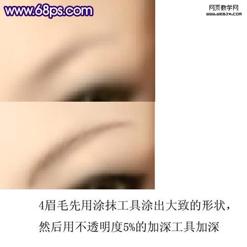 4、眉毛先用涂抹工具涂出大致的形狀,然后用不透明度5%的加深工具加深。