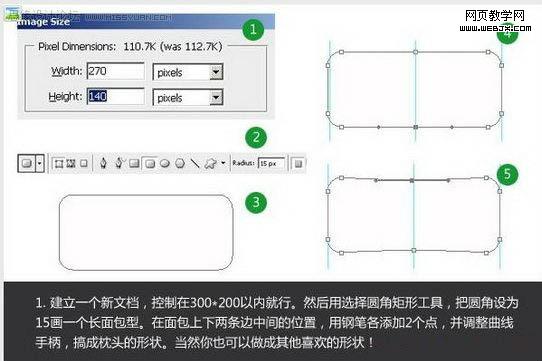 1、新建一個文檔,尺寸控制在300 * 200像素左右,然后選擇圓角矩形工具,把圓角設為15,畫一個長面包型。在面包上下兩條邊中間的位置,用鋼筆各添加2個點,并調整曲線手柄,做成枕頭的形狀。當然你也可以做成其它喜歡的形狀。