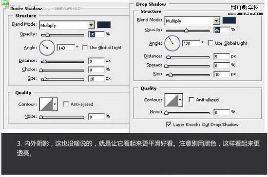 3、內外陰影,這也沒啥說的,就是讓它看起來平滑好看,注意別用黑色,這樣看起來更透亮。