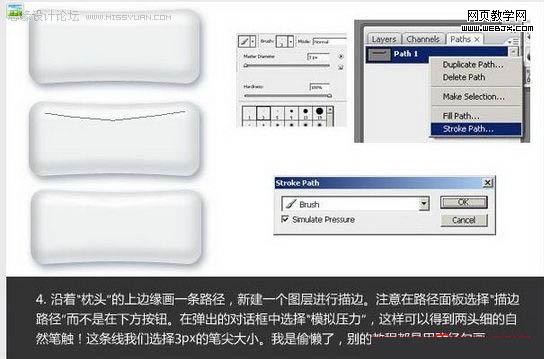 4、沿著“枕頭”的上邊緣畫一條路徑,新建一個圖層進行描邊。注意在路徑面板選擇“描邊路徑”而不是在下方按鈕。在彈出的對話框中選擇“模擬壓力”。這樣可以得到兩頭細的自然筆觸。這條線我們選擇3像素的筆尖大小。