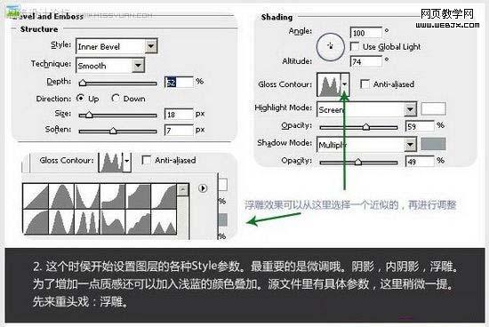 2、這個時候開始設置圖層各種樣式參數,最重要的是微調。陰影,內陰影,浮雕。為了增加一點質感還可以加入淺藍色顏色疊加。
