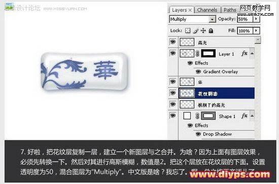 7、好了,把花紋圖層復制一層,建立一個新圖層與之合并。因為上面有圖層效果,必須先轉換一下,然后對其進行高斯模糊。數值為2.把這個層放在花紋層的下面。設置透明度為50,混合模式為“正片疊底”。
