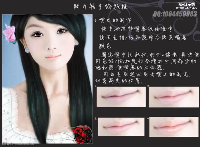使用涂抹工具將嘴唇紋路涂凈,使用色相/飽和度命令改變嘴唇顏色。圈選嘴中間部分,羽化2個像素,再次使用色相/飽和度命令增加中間部分的飽和度,加強嘴唇的立體感。然后用白色畫筆畫出嘴唇上的高光,注意好高光的位置。