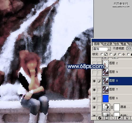 8、新建一個圖層,蓋印圖層,執行:濾鏡 > 模糊 > 高斯模糊,數值為5,確定后把圖層混合模式改為“疊加”,圖層不透明度改為:30%,效果如下圖。