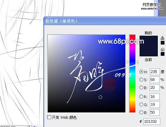2、用鋼筆順著草圖輪廓勾出頭發(fā)部分,轉(zhuǎn)為選區(qū)后新建一個圖層填充顏色:#101332。