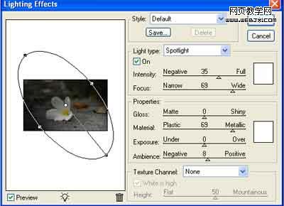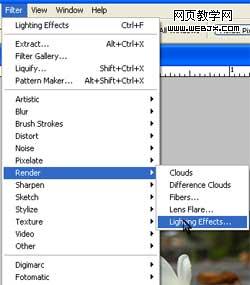 2、在濾鏡菜單中找到渲染,然后在渲染選項中,選取燈光效果。左邊的對話框的預覽窗口中你可以看到默認的設定:從右下角指向左上的橢圓形光源。
