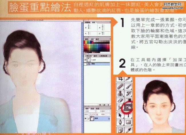 2、在工具箱內選擇加深工具,在人的臉上來回畫出立體感的色階。
