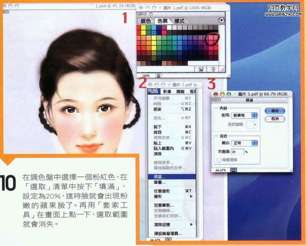 10、在調色板中選擇一個粉紅色,再選取清單中按下填滿,設定為20%,這是臉就會出現粉嫩的蘋果了。再用套索工具在畫面上點以下,選取范圍就會消失。