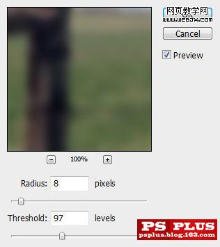 再次復制背景層。并將復制層移動到所有圖層頂端。設置表面模糊如下。半徑8像素。閾值97色階。
