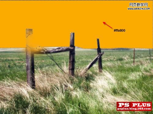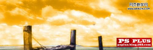 再復制天空層。并移動到所有圖層頂端。按住ctrl。左鍵點擊圖層縮略圖。載入天空層選區。用油漆桶工具填充純色#ffa800