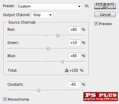 對天空圖層使用通道混合器。選中單色。紅通道加60%。綠加10%。藍加85%。