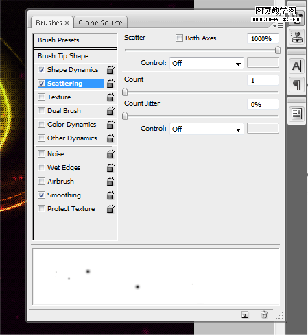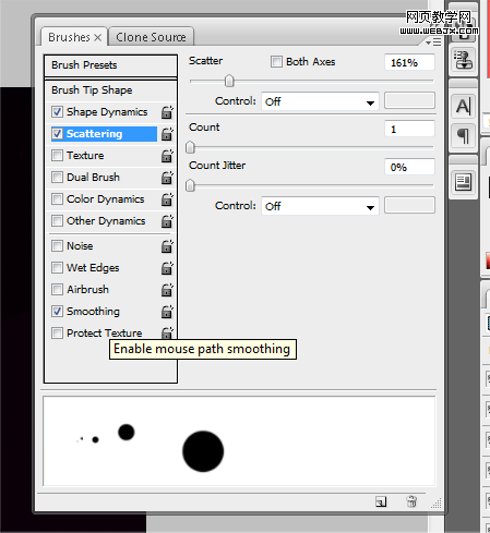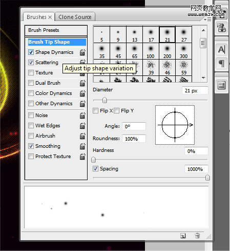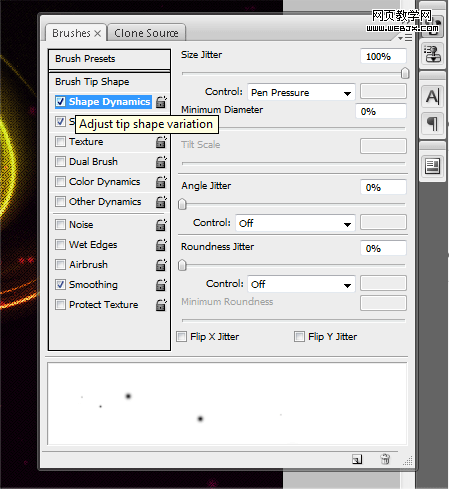 在動態形狀中調整大小抖動為100%。如果你用鋼筆工具那鋼筆壓力的選擇允許的效果取決于所操縱的刷子的力量。