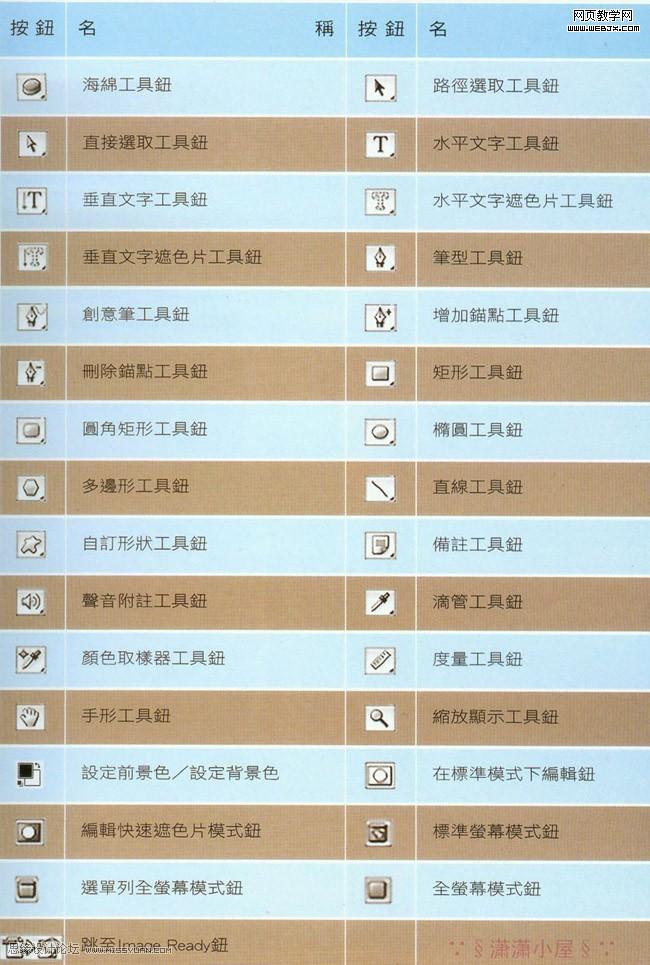 下面是photoshop的各式工具鈕表,這對學習photoshop的新手,會起到很大的作用。學教程時,先要了解到到個工具的作用和名稱。