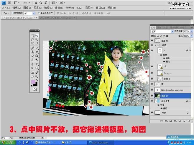 3、點(diǎn)中照片不放,一直到把照片拖進(jìn)模板里為止。