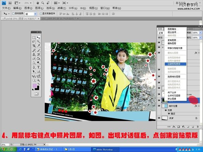 4、用鼠標(biāo)右鍵,點(diǎn)中該照片的圖層,出現(xiàn)對(duì)話框后,選創(chuàng)建剪切蒙版,如圖所示。
