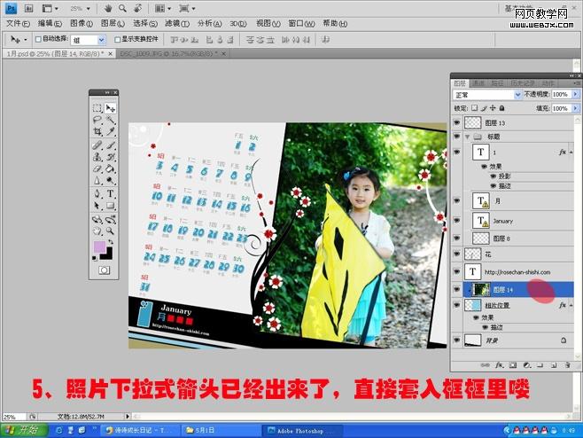 5、請(qǐng)看圖層面板上,照片旁邊有個(gè)下拉式的箭頭了。照片已經(jīng)完完整整的套進(jìn)空白框里了哦。這里您只要把照片稍稍移動(dòng)一下即可。
