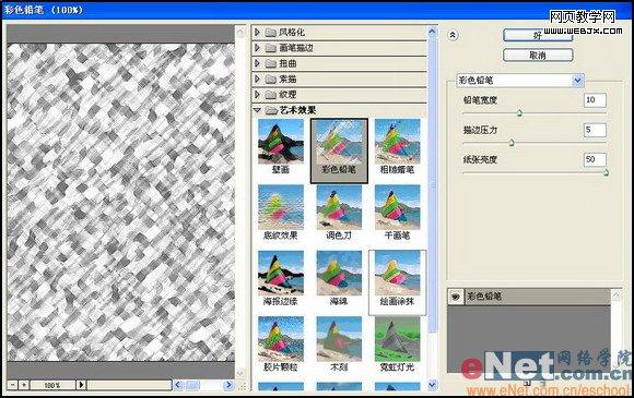 15、執行菜單欄中“濾鏡”“藝術效果”“彩色鉛筆”命令,在打開的彩色鉛筆對話框中設置參數如圖19所示,圖像效果如圖20所示。