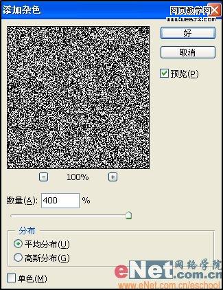 13、單擊通道面板下方的創建新通道按鈕,生成新通道3,執行菜單欄中的“濾鏡”“雜色”“添加雜色”命令,在打開的添加雜色對話框中設置參數如圖15所示,圖像效果如圖16所示。