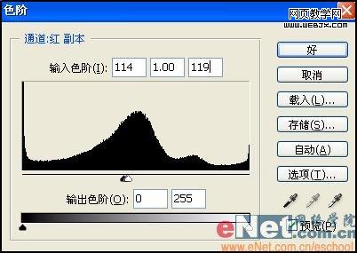 19、選擇通道4,按ctrl+l鍵打開色階對話框,設置參數如圖26所示,效果如圖27所示。