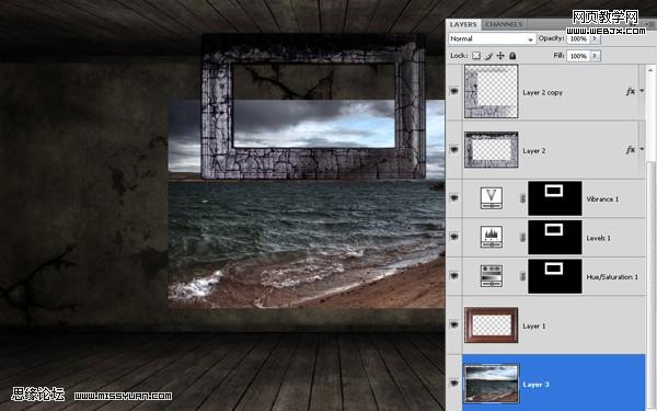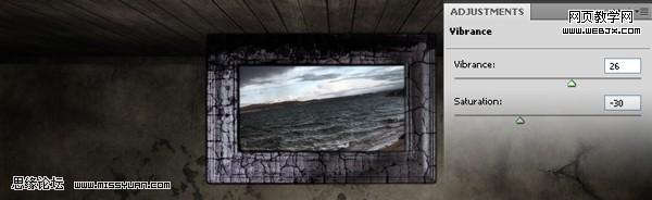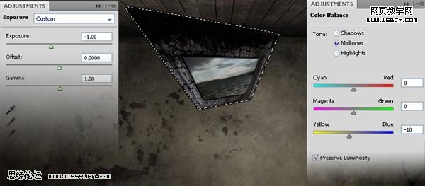 調整圖效:亮度/對比度:26 , -30.。合并海景素材和相框。現在使用自由變換工具,(ctrl+t)選擇扭曲講相框的角點拉出變形,如下圖所示。(你可以想象它正被強大的力量吸引)設置曝光度 -1.00 ,添加色彩平衡:(中間調)0,0,-10。