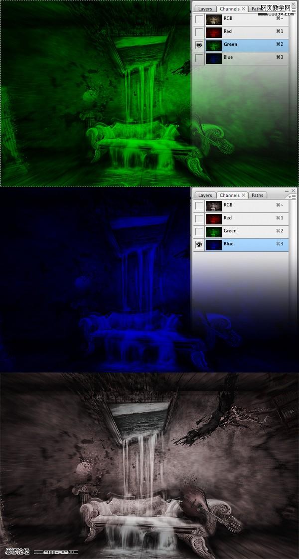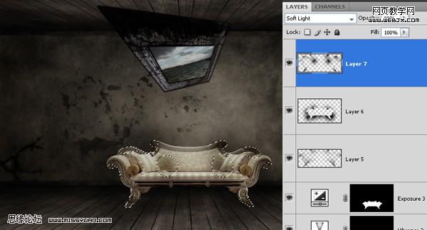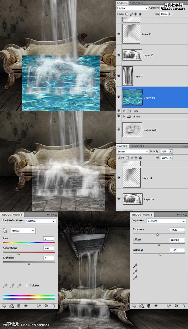 現在開始處理另外一個關于水的素材。這個素材主要用在地板上。將素材拖移進來,擺好位置。使用自由變形工具,將較低的角落變形,增加透視感,然后,圖層去色,圖層模式柔光,不透明度60%。最后使用柔筆,橡皮擦工具,擦除低處和右邊的部分,講圖片融合起來。使用減淡工具(o)給水的部分增加深淺的感覺。調整圖效,色相/飽和度: (0,-40,0) and 曝光度(-0.40).