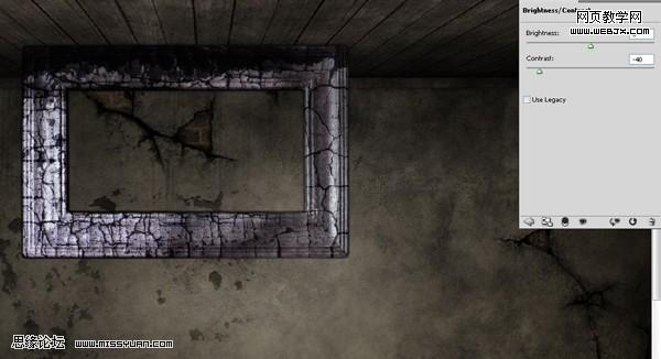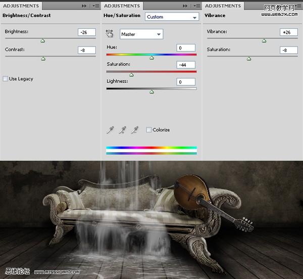 最后,將圖片融合混合,讓它看上去舊一點。調整圖效:亮度/對比度:-26,-8,色相/飽和度:0,-44,0