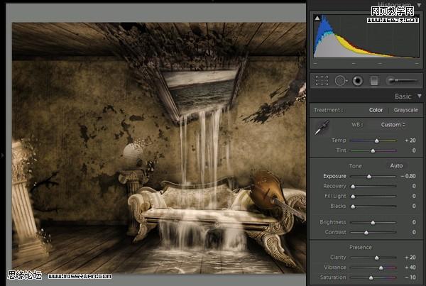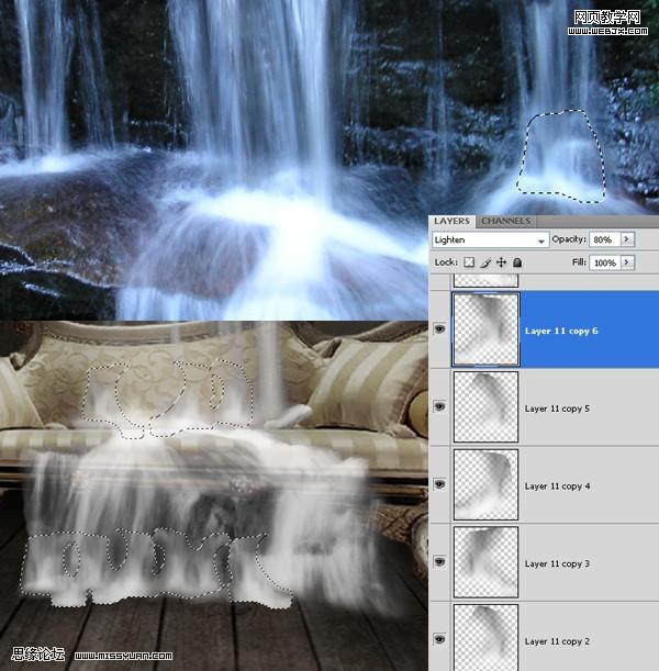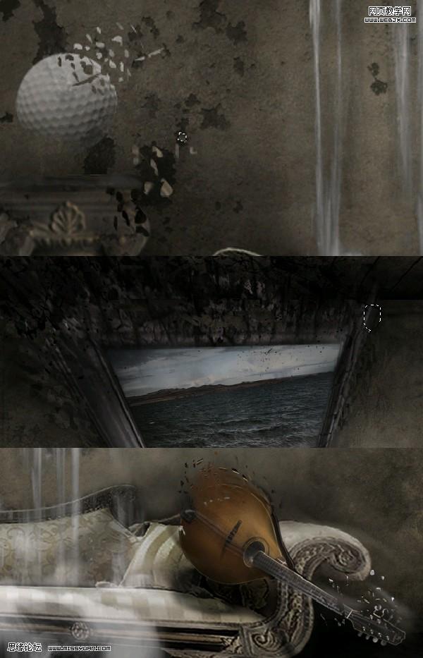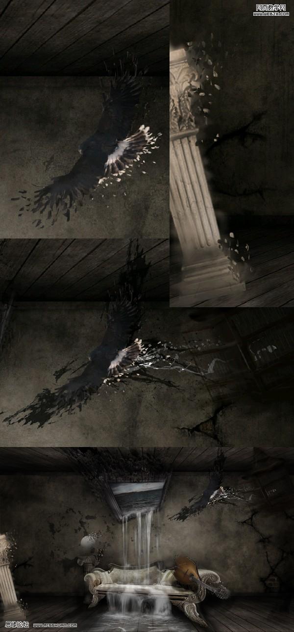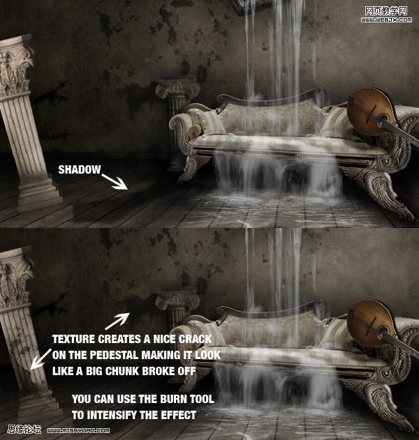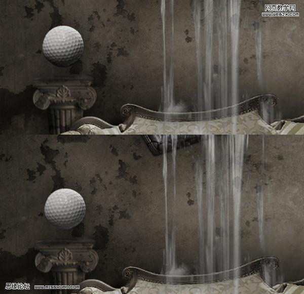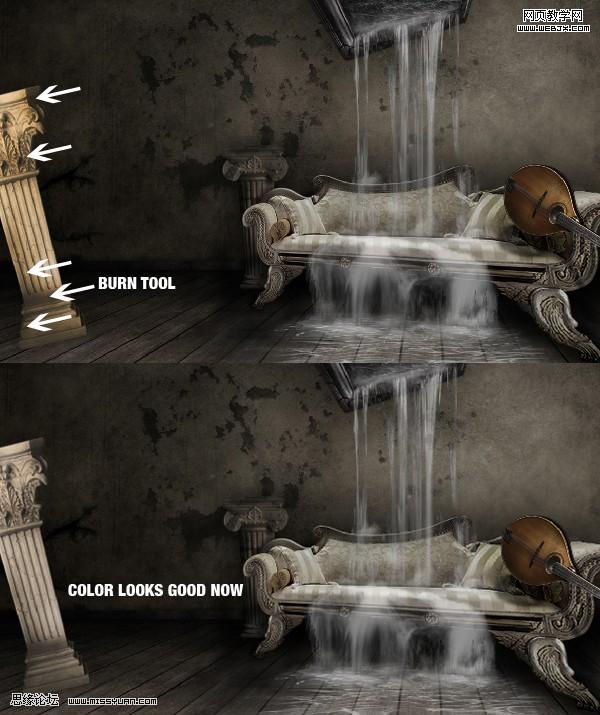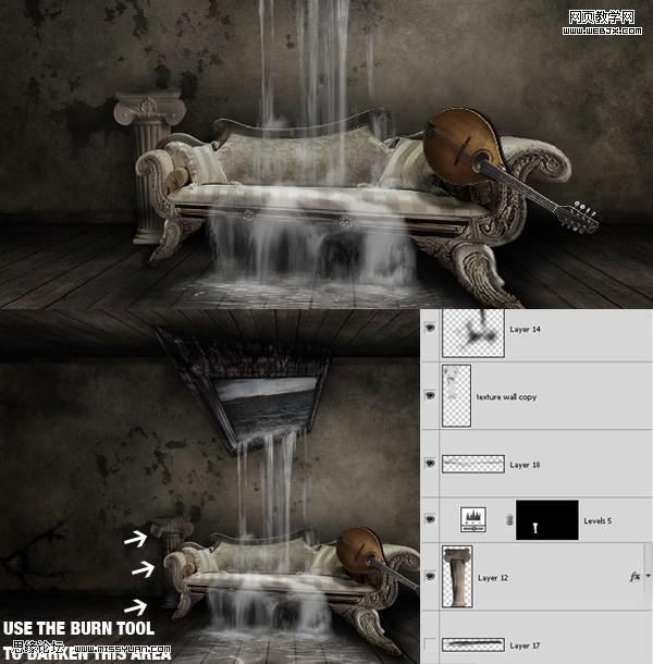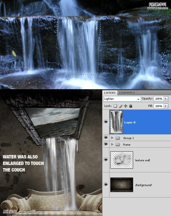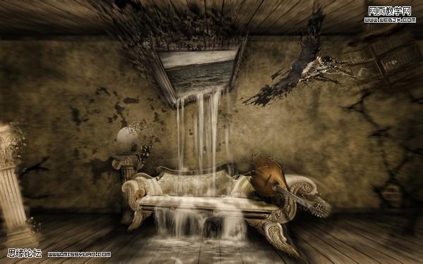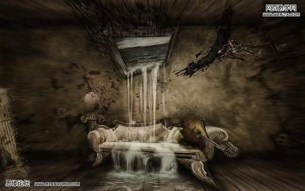 記住在本步驟中使用小的水素材,將各個部分擺好位置,讓他們由油畫傾瀉到沙發和地板上,然后就是與畫面邊緣接觸的部分有點怪了,需要挑選一些合適的水的流感,讓瀑布感重現,這一步可能花費你比較長的時間。