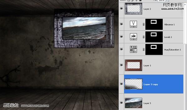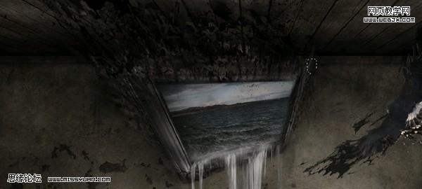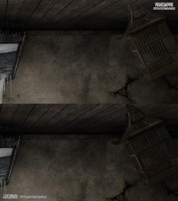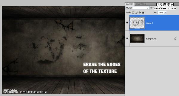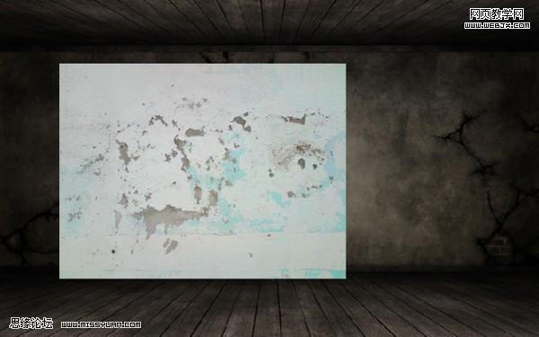 打開黑暗舊房間圖片,這個房間看起來相當不錯,但是我們想要增加一些裂痕(裂縫),所以,使用帶有痕跡的素材,調整素材大小到合適大小。