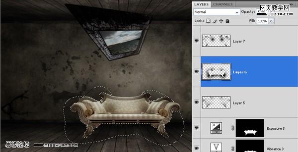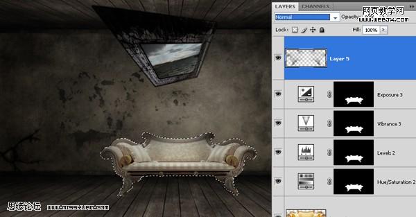 讓我來繼續添加素材--石柱。用鋼筆工具摳出石柱素材,拖進來,擺好位置。放在沙發圖層下面。