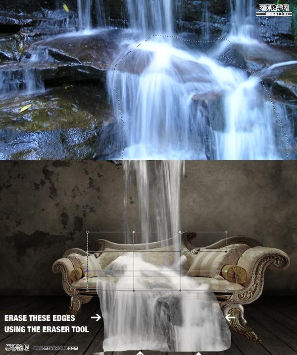 選取一部分瀑布素材,移動到我們的文檔中來,使用自由變形工具(ctrl+t),較好的將水和背景圖融合起來。