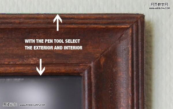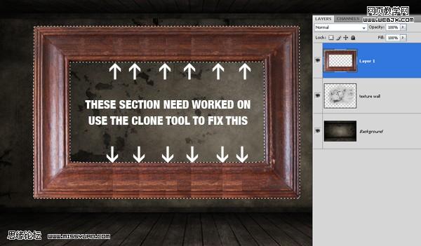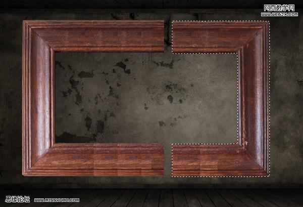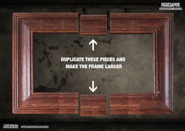 添加相框素材到場景中,先使用鋼筆工具(p),去除相框外的背景。選擇框架部分,ctrl+j,復制出相框部分, 下一步,將相框拉長,在復制的小相框部分擺好位置后,合并圖層,使用仿制圖章工具 (s)處理下框架,是相框看起來像是一個整體。