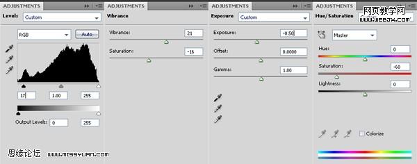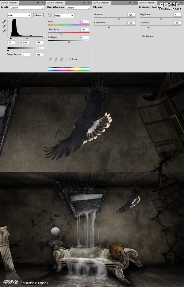 下一步就是鳥的后續處理步驟了,添加色階:20,1.00,255;色相/飽和度:0,-40,0;亮度/對比度:0,-30