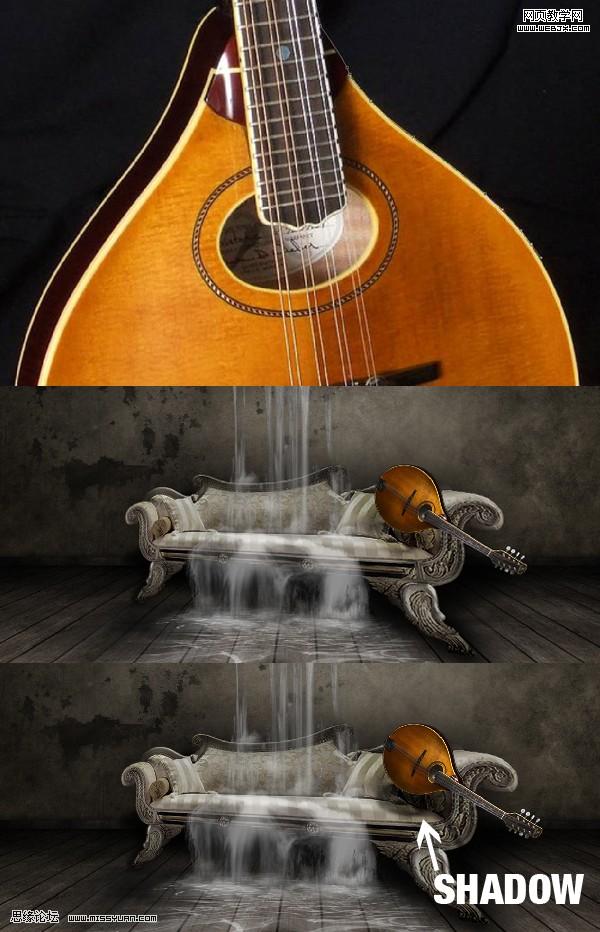 現在來添加另外一個素材-小提琴素材。從背景中扣出小提琴素材,拖移到圖中,擺好位置,靠近沙發,讓它感覺浮在沙發上。