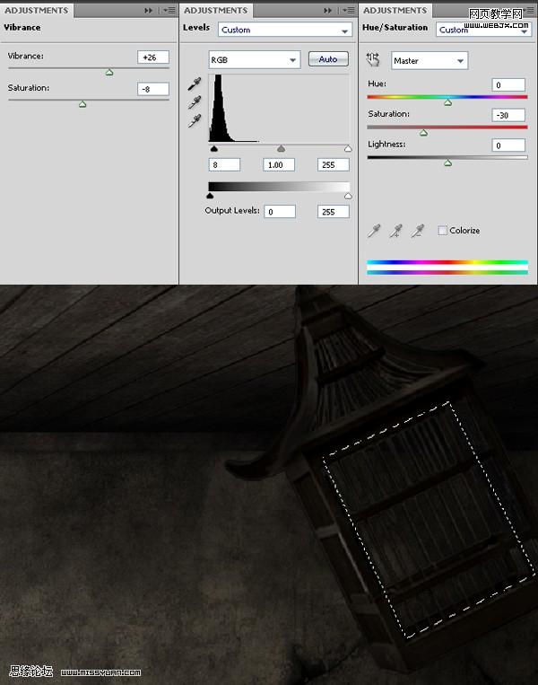 現在給鳥籠處理一下色彩和效果。色階:8,1.00,255;色相/飽和度:0,-30,0
