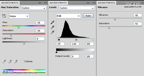 現在需要給相框上一點色彩效果。 選擇色相/飽和度:-25,,-60 ,0; 色階: 17, 1.00, 255; 亮度/對比度: -26 ,-53.。如下圖所示。