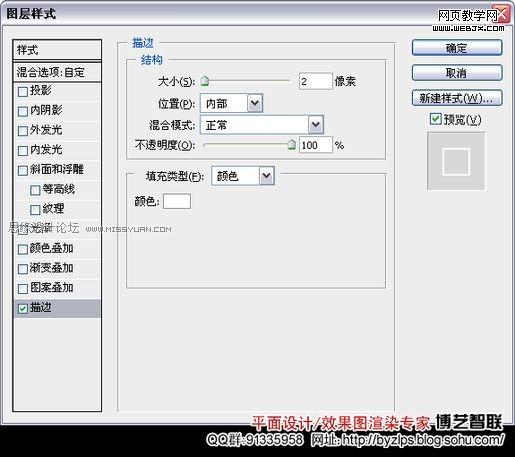 11、下面制作描邊效果。單擊添加圖層樣式按鈕,在彈出的菜單中選擇“描邊”命令,參數(shù)設(shè)置及效果如下圖。