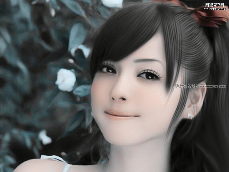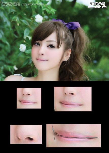 5.鼻子部位用涂抹工具進行細微的修復,嘴巴部分的中間線用畫筆描邊的方法加深一點,嘴唇先用涂抹工具輕輕的涂抹,再用加深、減淡、模糊工具分出明暗部。