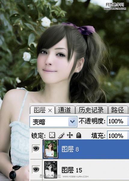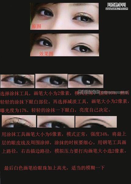 3.人物眼睛看上去不夠有神,所以要進行改造。ctrl+j復制一層,利用涂抹、加深、減淡,模糊工具仔細的操作。。。本人制作過程如下圖: