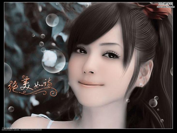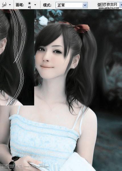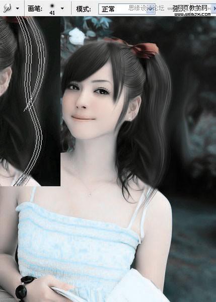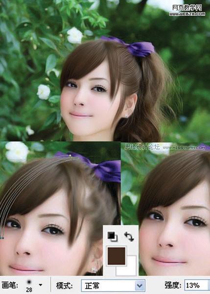 7.我對前半部分的頭發不是很滿意,就自己修改了一下。ctel+j復制一層,先用涂抹工具。畫筆為28像素,強度13%,順著人物的頭發進行涂抹。然后用鋼筆工具順著頭發畫出路徑,描邊路徑,畫筆為2像素,顏色用吸管工具選頭發色為背景色。模擬壓力打上溝。